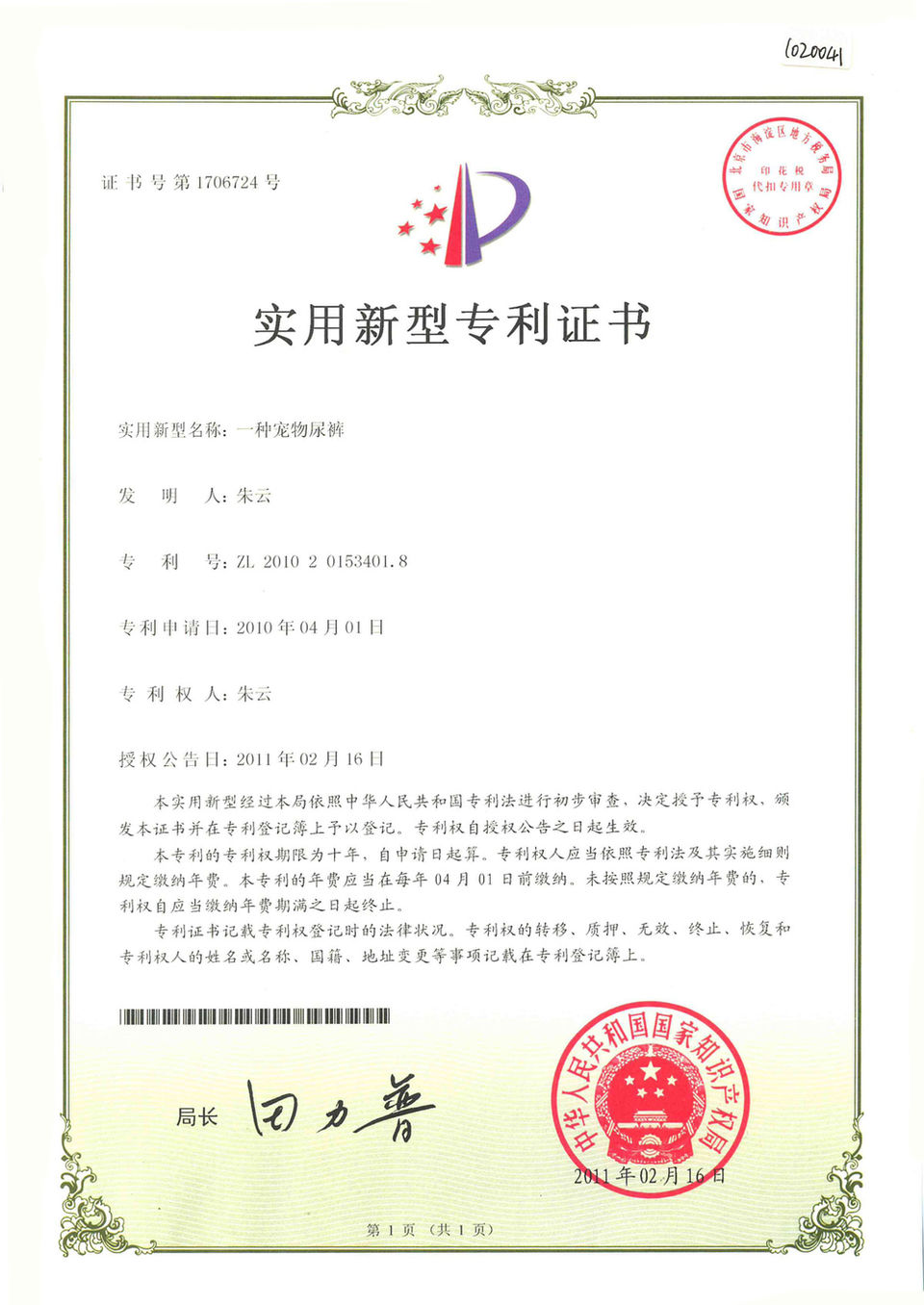 Chinese Patent No.: ZL 2019 2 1790652.4